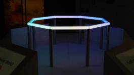 Four touchscreens embedded in a round table allow participants to answer questions and make decisions together. A glowing LED ring visualizes the collective process, showing how individual voices merge into a shared outcome.
